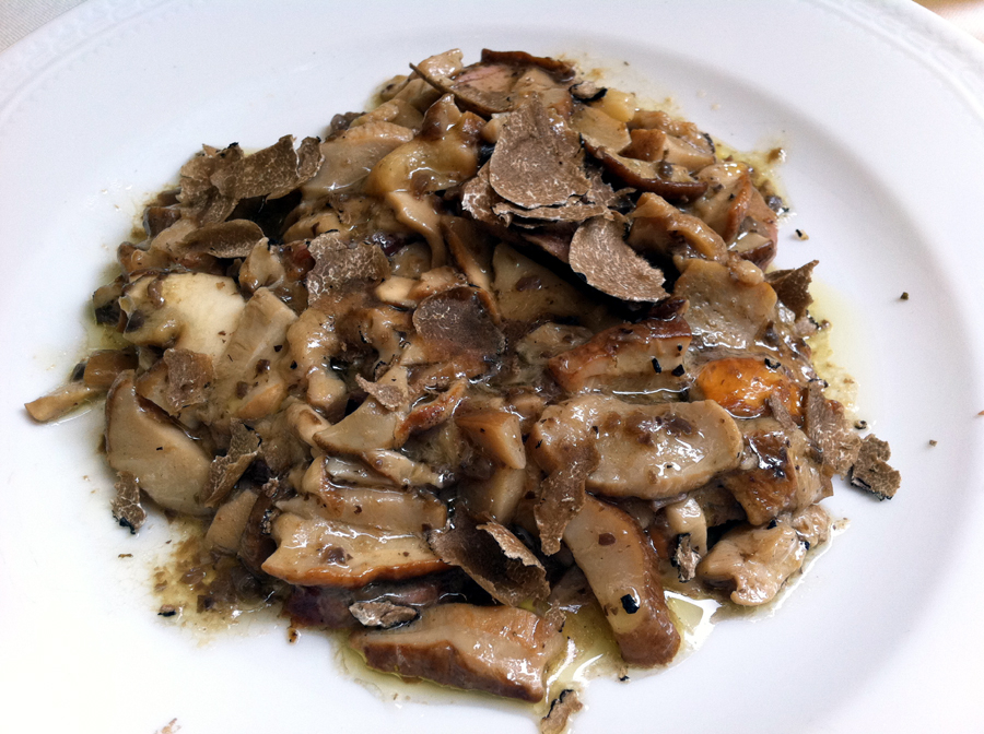A Tagliata vágottat jelent, de bevallom, az ételek megnevezéseinek szabatos fordítására nem vagyok képes. Ha azonban leírom a fogást a maga valóságában, akkor máris életszerűbbé válik az egész. Az én szarvasgombás ételem nem volt valami bonyolult: a rózsaszín kacsasültre egy tonna vargányát raktak, mely egy kiló szarvasgombával “lazítottak”. A hús mártásában természetesen önmagában is megjelent a szarvasgomba, így az Umbriára oly jellemző két gombafajta szimbiózisa tényleg emlékezetes marad. A kacsahús pácolása, sütése a legmagasabb igényeket is kielégítette, a legmagasabb igényeket.