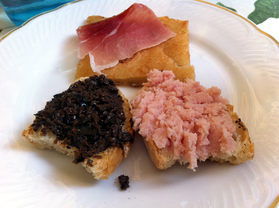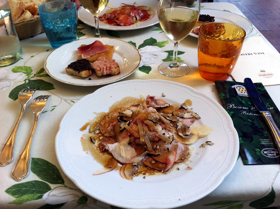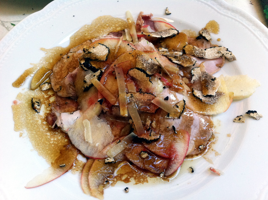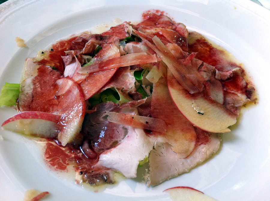 A salátaágyra helyezett borjúhús igen vékonyra vágott szeleteit balzsamecettel locsolták meg és arra jelentős mennyiségű szarvasgombát hántottak. A saláta pikantériáját az alma és parmezán fokozta. Kísérőként olyan kenyérszeleteket adtak, melyek neveit nem lehet, inkább nem érdemes lefordítani, a képekről be kell azonosítani, és az emlékekbe elraktározni, ugyanis a szarvasgomba krémmel, és más nyalánkságokkal megtűzdelt szeletek önmagukban is tökéletes élvezetet nyújtanak, de így, a salátával már maga mennyország!