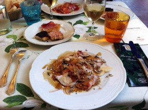 Az étteremben még senki nem volt, alig ütötte el a nagy óra a hatot, mi már “occupare” egy asztalt, mely határozottság feltűnt a személyzetnek, mivel nagy valószínűség szerint maga a tulajdonosnő jött elénk. Sikerült angolul szót értenünk vele – a megfelelő gasztronómiai olasszal kiegészítve – így hamar az asztalunkra került a megfelelő helyi fehérbor, a víz, és a döntés is megszületett. A séf által összeállított két degusztációs menüt választottuk.