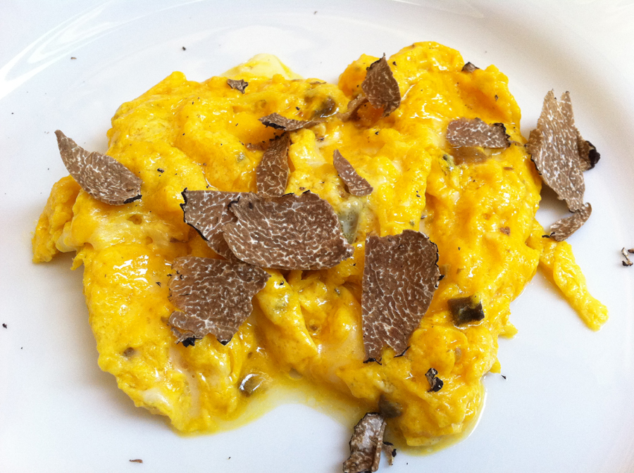 A következő fogás tészta lett volna, ám csodálkozásomat és leplezetlen örömömet fokozván a séf kiküldött egy “egyszerű” tojásrántottát, mely egy örök életre “ehetetlenné tette” az összes reggelimet, ha azt rántottával képzelném el. Ugyanis a szarvasgombát belesütötte a tojásba, és a tetejére egy kazallal hántott. A gomba és a tojás olyan harmóniát alkot, mely számomra – egyelőre – überelhetetlen.